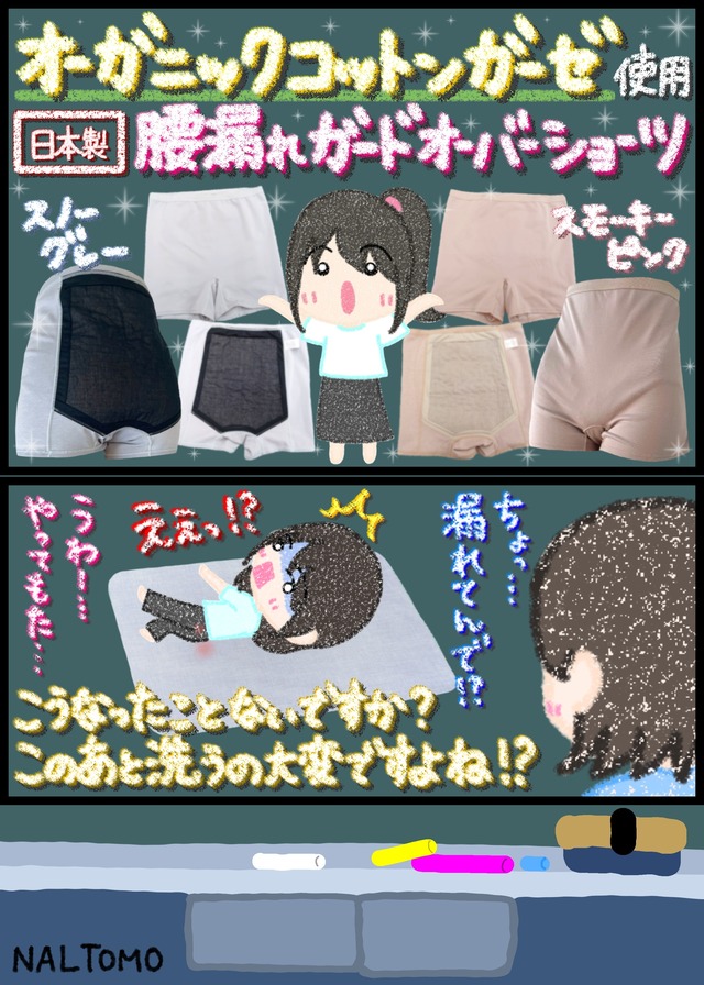 吸水ショーツの材料を開発している私たちが、 「この場面で吸水ショーツを使いたい」 を形にした商品。 「寝ている時の漏れが不安…」 「漏れた後の寝具の洗濯が面倒!」 という悩みを軽減するオーバーショーツです。 ・睡眠時にベッドが汚れた経験がある方、不安な方 ・仰向けで寝る方 ・吸水パッドで尾てい骨より後ろをカバーしたい、 でもオムツ型ナプキンを買うほどでもない方 ・防水シーツを使っているがクシャッとなるし、 洗うのが面倒だと思っている方 ⚫︎お取り扱いの注意 ①吸水パッド、サニタリーショーツなどとの併用を 前提としておりますので、この商品のみで使用し ないでください。 ②デュアルマジック(R)は完全に水分の染み出しを防 ぐものではございません。 ③柔軟剤を使用されると生地の撥水機能が無くなり ます。 ④洗濯脱水後、吸水部分が表に来るように裏返して干してください。 ⑤生乾きで放置するとカビが発生する恐れがあるので、しっかり乾燥させてください。 ⚫︎混率:身生地:ポリエステル83%、綿10%、 ポリウレタン7% マチ肌面生地:綿100%ガーゼ(オーガニック コットン100%) 吸水体:キュプラ他 ⚫︎カラー:スモーキーピンク、スノーグレー ※初回生産分混率表記誤りあり。