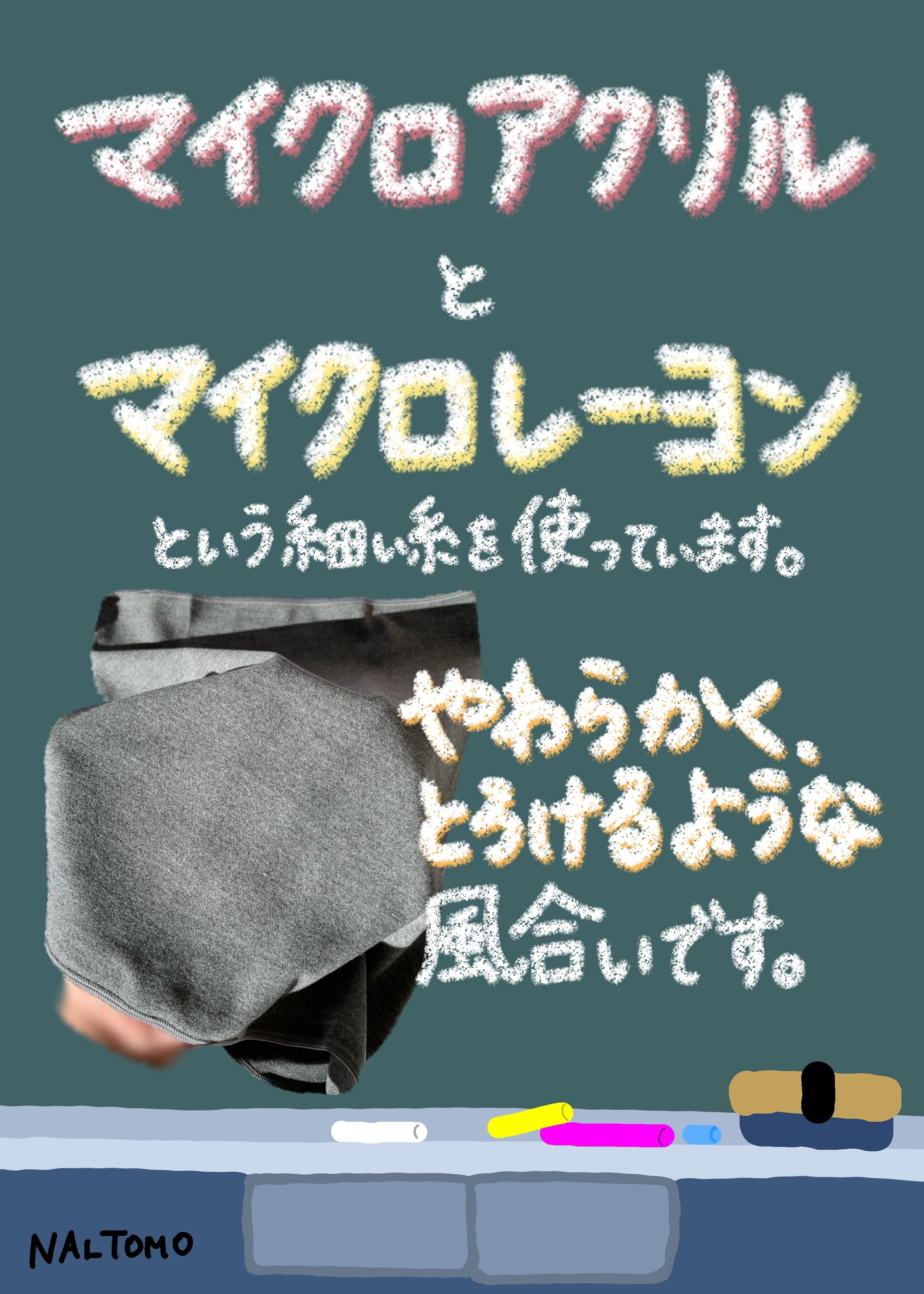 マイクロアクリルとマイクロレーヨンの混紡糸に起毛をかけてる生地を使用。